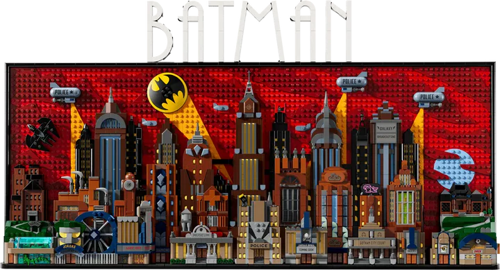 This 4,210-piece buildable GOTHAM CITY backdrop measures over 30 in. (76 cm) wide. It incorporates 15 panels that remove to reveal the inside of Wayne Manor, the Batcave™ and Arkham Asylum, and the activities of numerous villains from Batman: The Animated Series. The set also includes 4 minifigures – Batman, The Joker™, Harley Quinn™ and Catwoman™ – and a removable Batmobile™ and Batwing™. The assembled model can be mounted on a wall or stood on a surface using a flip-out stand. The 2 sets of included building instructions allow 2 people to work on the model simultaneously. For added convenience, a digital version of the set’s building instructions can be found on the LEGO Builder app.